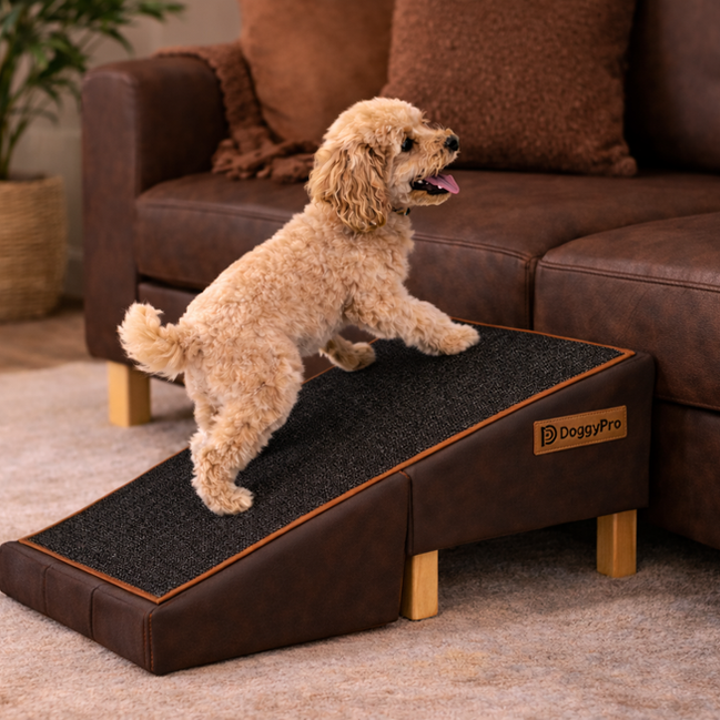 The DoggyPro StepGuard™ 2-in-1 Pet Ramp & Ottoman is designed to help dogs safely and comfortably reach sofas, beds, and other elevated surfaces without jumping or strain.